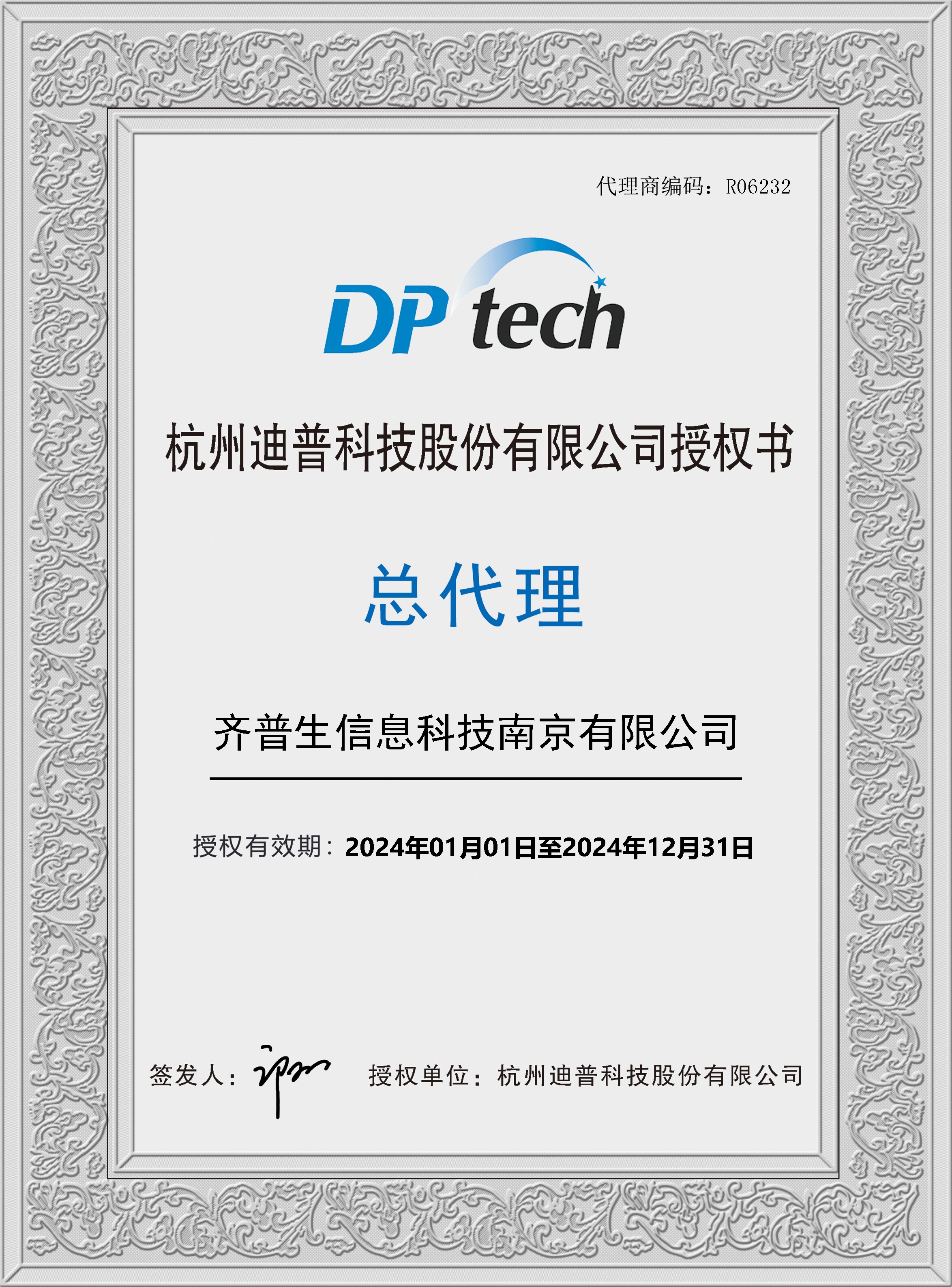 • 2024年迪普總代理證書(南京公司)