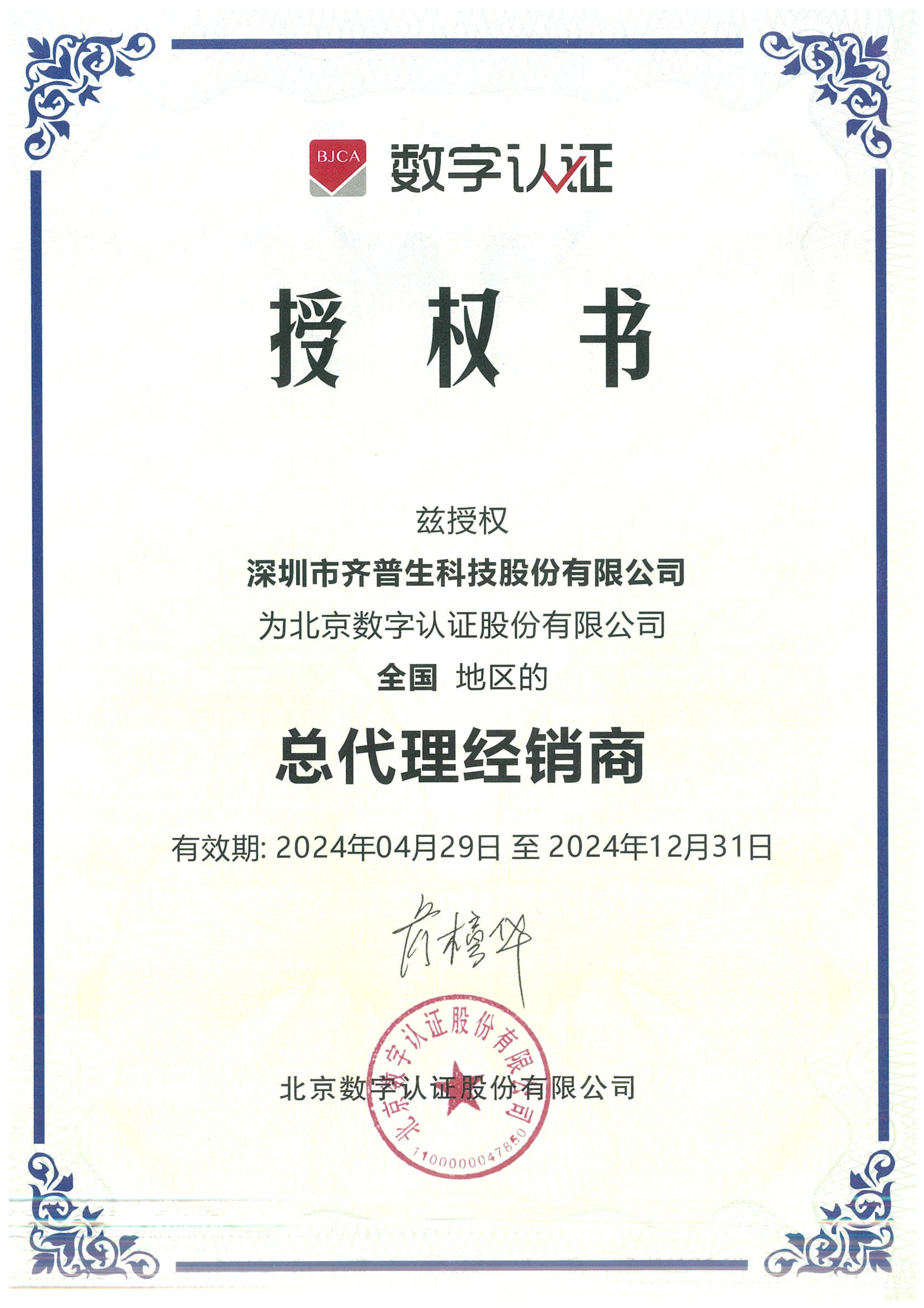 • 數(shù)字認(rèn)證總代證書
